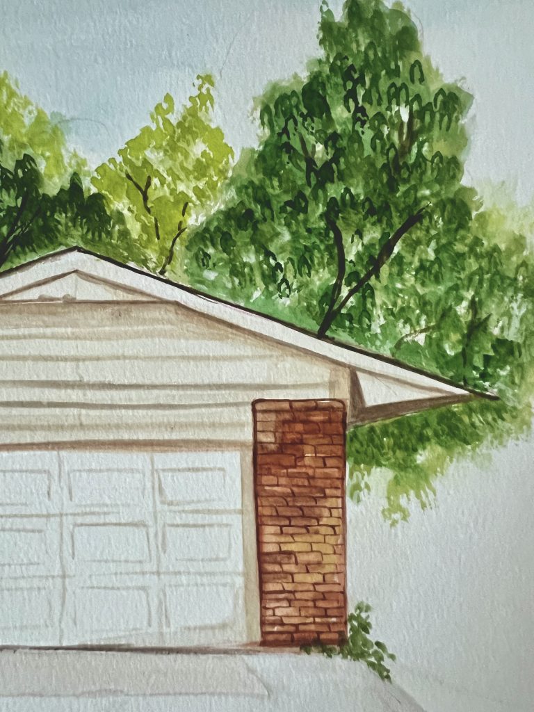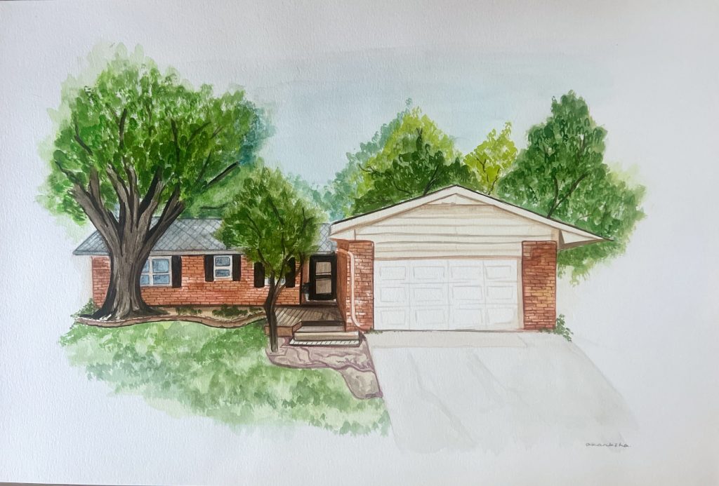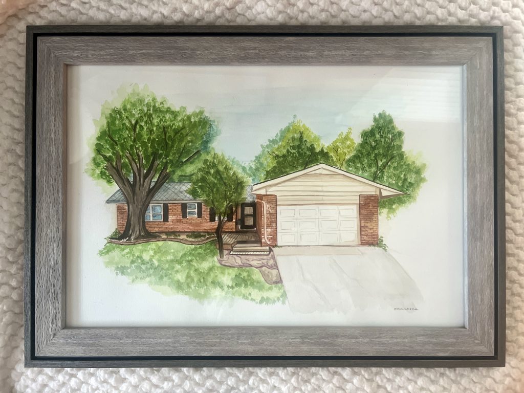 AUGUST 2024 This artwork was a painting of the house she lived in during college in Oklahoma. This house held a lot of memories and will continue to live on with her now!