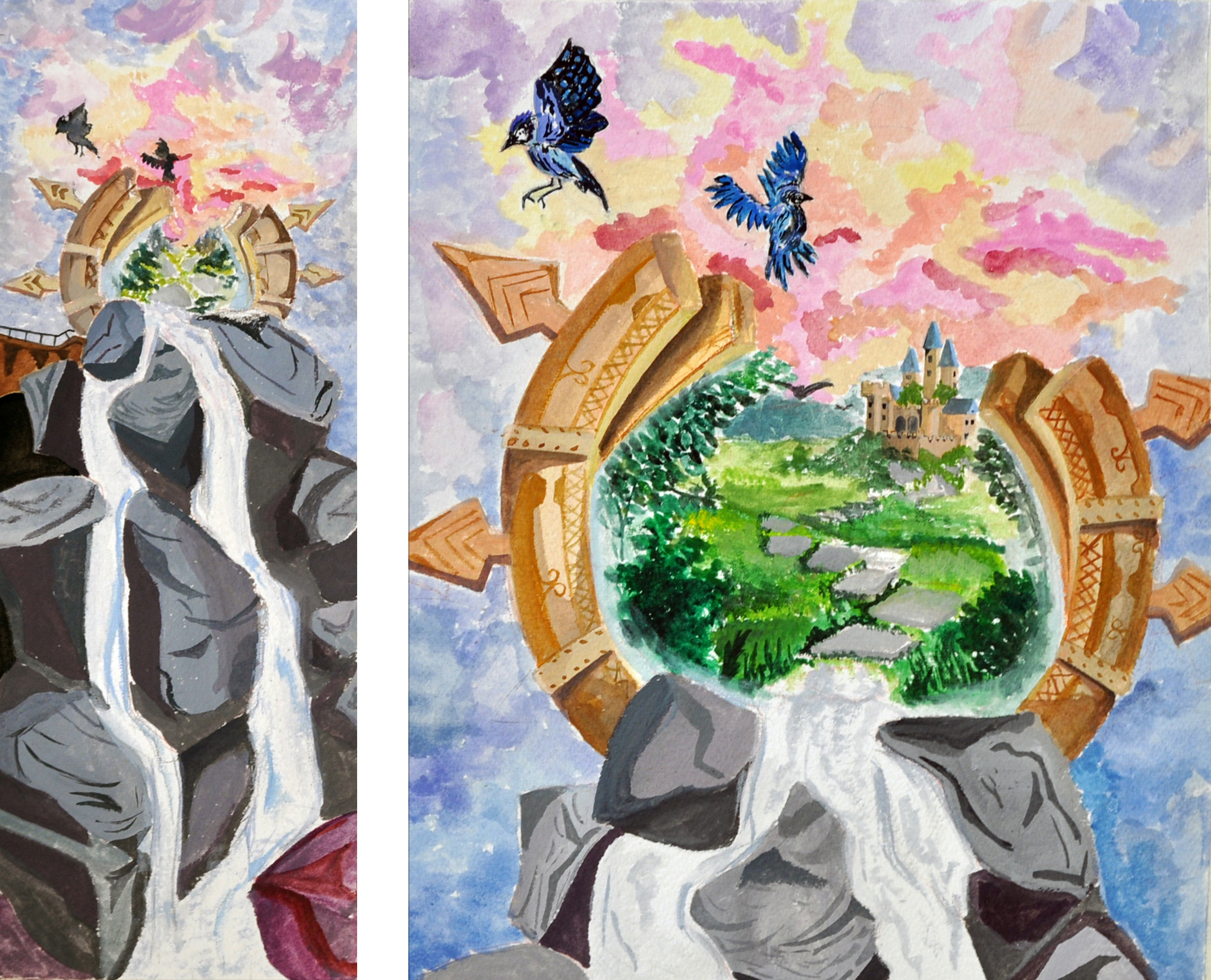 His eyes opened at his resurrection and suddenly the portals weren’t temptations, but rather, his path. He looked around at the life that surrounded him and he began to climb the waterfall. The bright blues and vivid reds transformed his reality to something ethereal, almost as the scenery for a mythical hero’s journey. In the distance, lay a castle that called him. His metamorphosis made him worthy, worthy to sit on the throne…